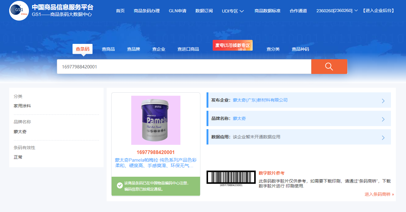 登录中国商品信息服务平台(https://www.gds.org.cn/#/home/index),输入条形码,即可进行信息查询。蒙太奇全系列产品的“加码”工作正将逐步完善中,敬请期待。