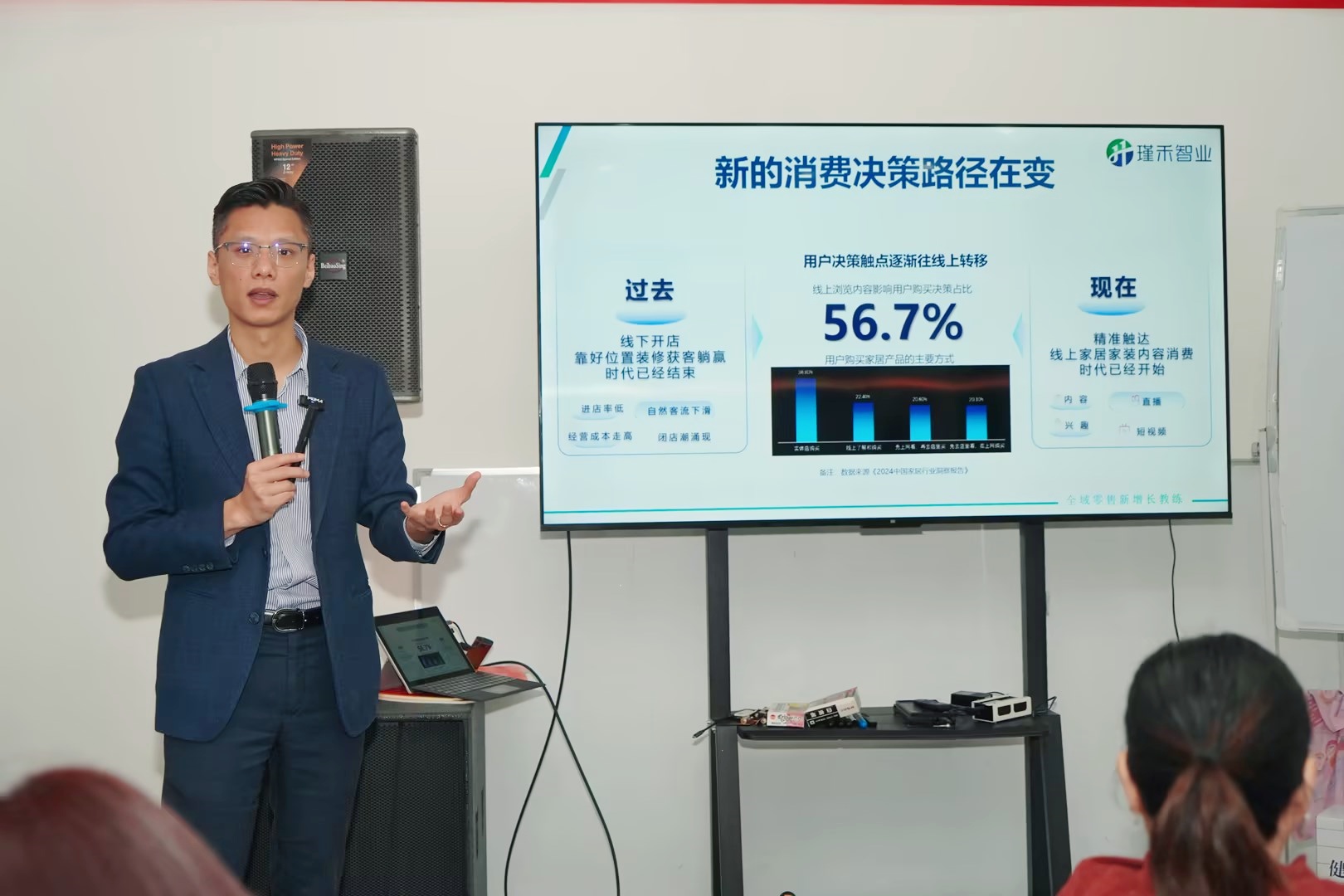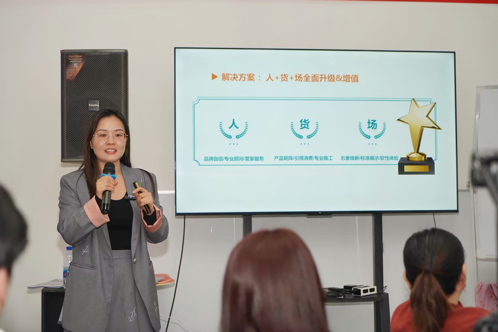 跨年大促活动中,粤闽琼将三地联动年末狂欢,共同探索终端门店O2O新营销模式。因此,在特训营课程第二天,蒙太奇品牌联合创始人、艺术涂料最美老板娘吕芳方,聚焦“消费降级与行业内卷下门店强势动销的策略”,从人、货、场三个维度,融合线上线下成交逻辑,为现场的经销商家人们进行了专题培训,指导经销商如何有效拓宽获客渠道、提升转化效率。