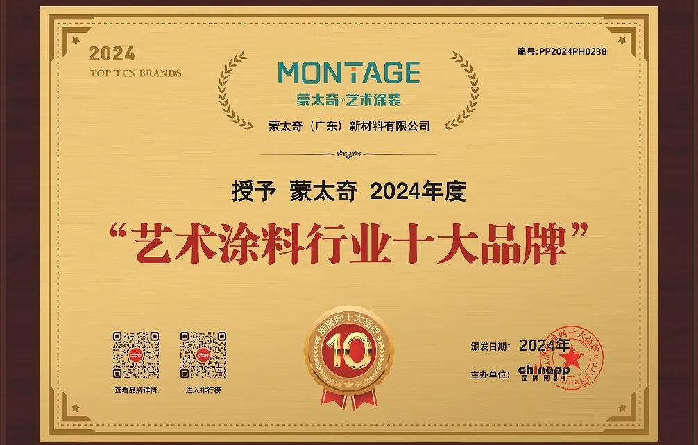 近日,品牌网经过专业的评测,选出了“2024年艺术涂料十大品牌排行榜”,蒙太奇荣耀登榜。本次评选活动历经“投票点赞、评审打分公示”+“权威公正研究、专业......