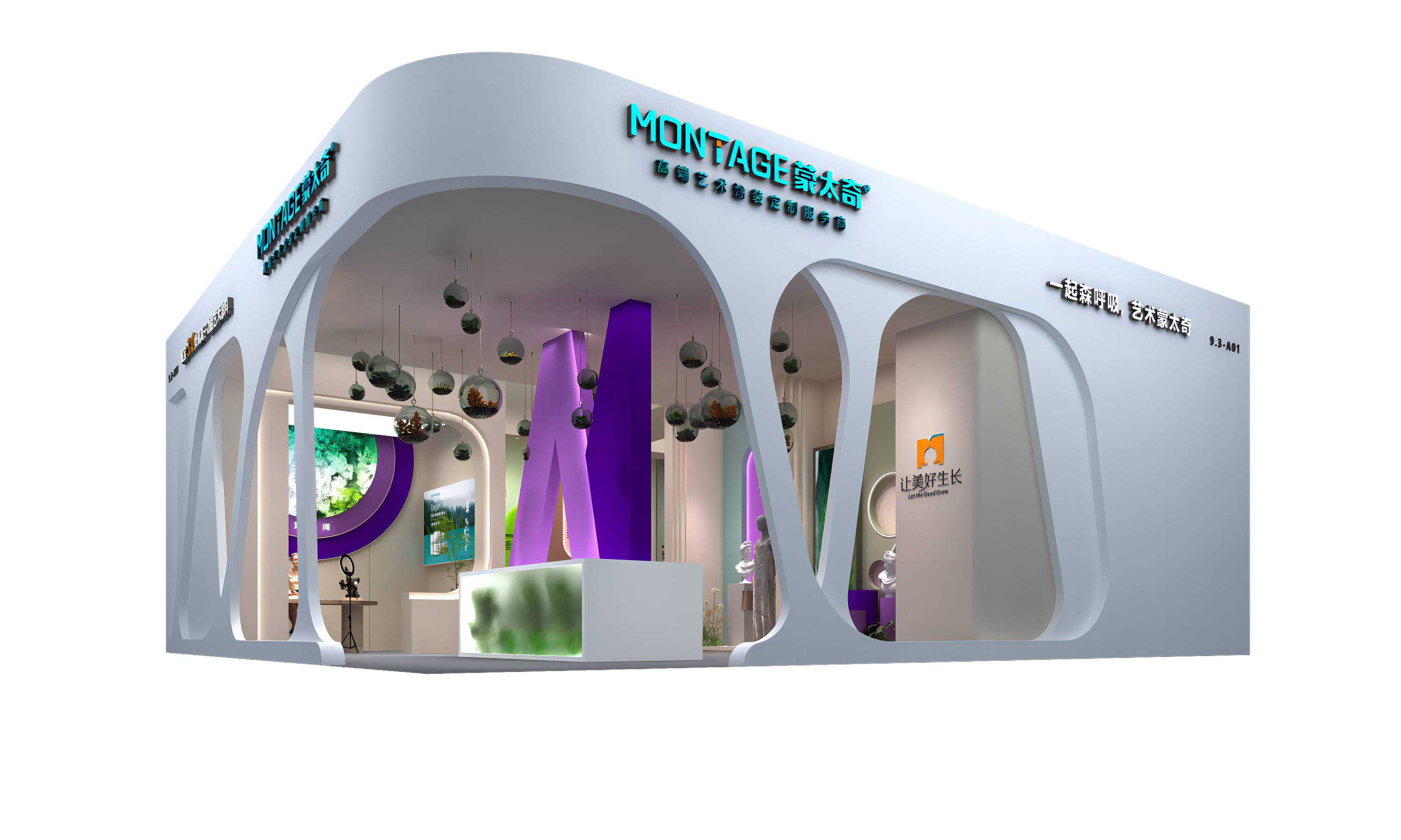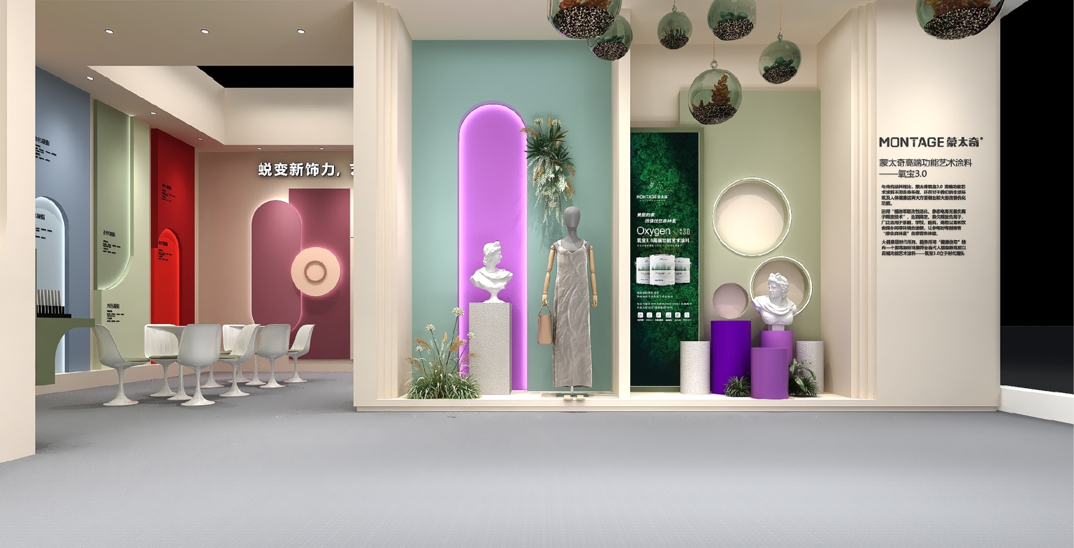 当“艺术蒙太奇”“艺术=蒙太奇”符咒营销的序幕一旦拉开,扑面而来的只有传承与创新。2024年广州建博会,蒙太奇展馆虽然仍旧以“一起森呼吸·艺术蒙太奇”为主题,仍然以“氧宝3.0系列高端负氧离子功能艺术涂料”为主打,但蜕变的力量给了我们更多的惊艳:以蒙太奇品牌独特元素的“M”作为基本造型,以象征创新生命力的“破茧成蝶”为框架,辅以象征吉祥美好的“东来紫气”为聚焦色,在110㎡的场地里营造了一个负氧离子功能艺术涂料温润下的持续生长的美好空间。