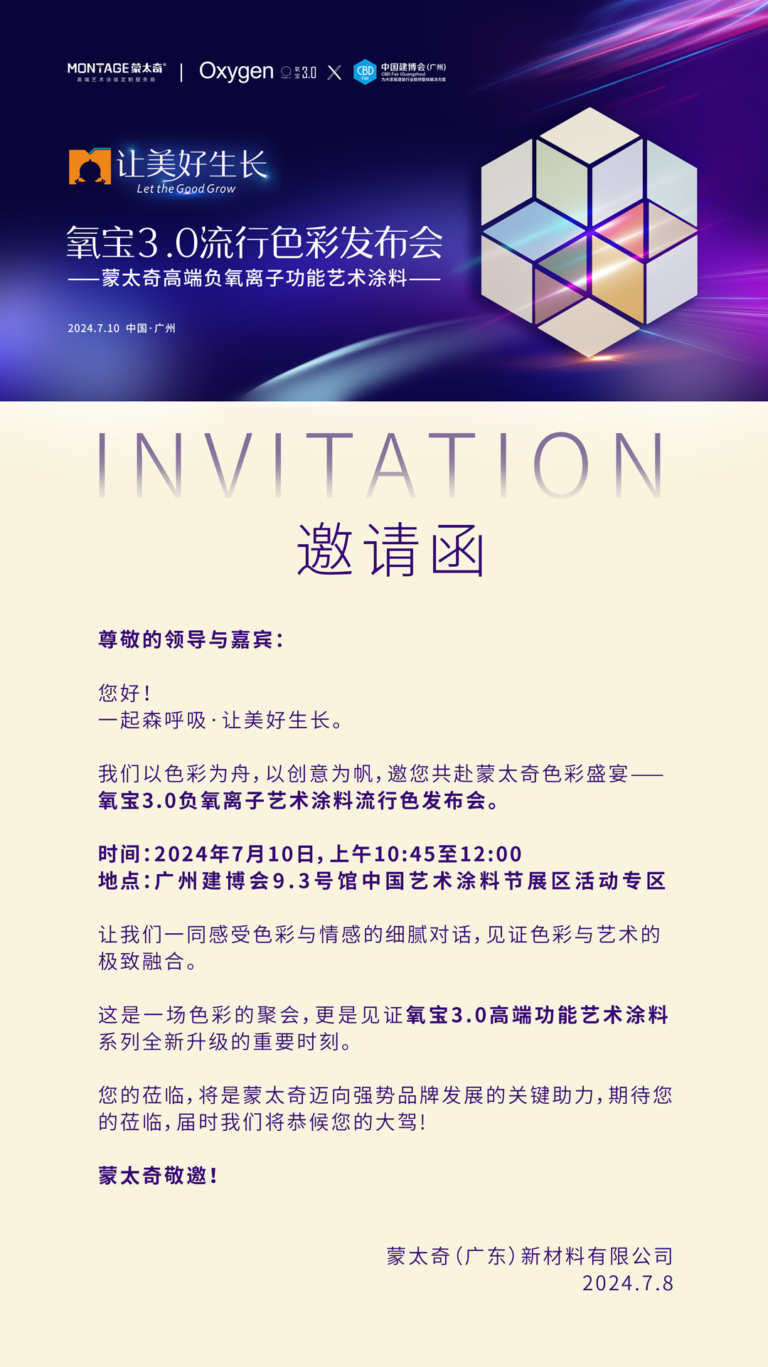 本次展会中,备受期待的蒙太奇氧宝3.0负氧离子艺术涂料流行色发布会,定于7月10日早上10:45至12:00正式启幕,届时揭秘氧宝3.0负氧离子艺术涂料技术与色彩蜕变的力量。诚邀您一起探索,从色彩的应用,感知家居美学。
