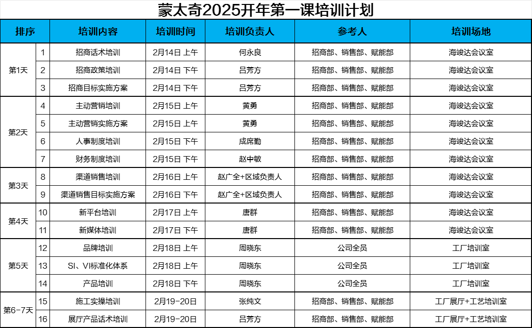 在接下来的六天的培训中,蒙太奇将展开一系列针对性强、实用性高的专业技能培训课程,涵盖招商策略、主动营销、渠道销售、新媒体运营、品牌SI/VI标准化体系、产品培训等多个领域。这些培训不仅有助于员工个人能力的提升,也将促进团队协作效率的全面提高。通过这次全面的培训,蒙太奇期待打造一支更具战斗力的专业团队,以更昂扬的姿态迈向新一年的征程,向着更高更远的目标奋力冲刺。