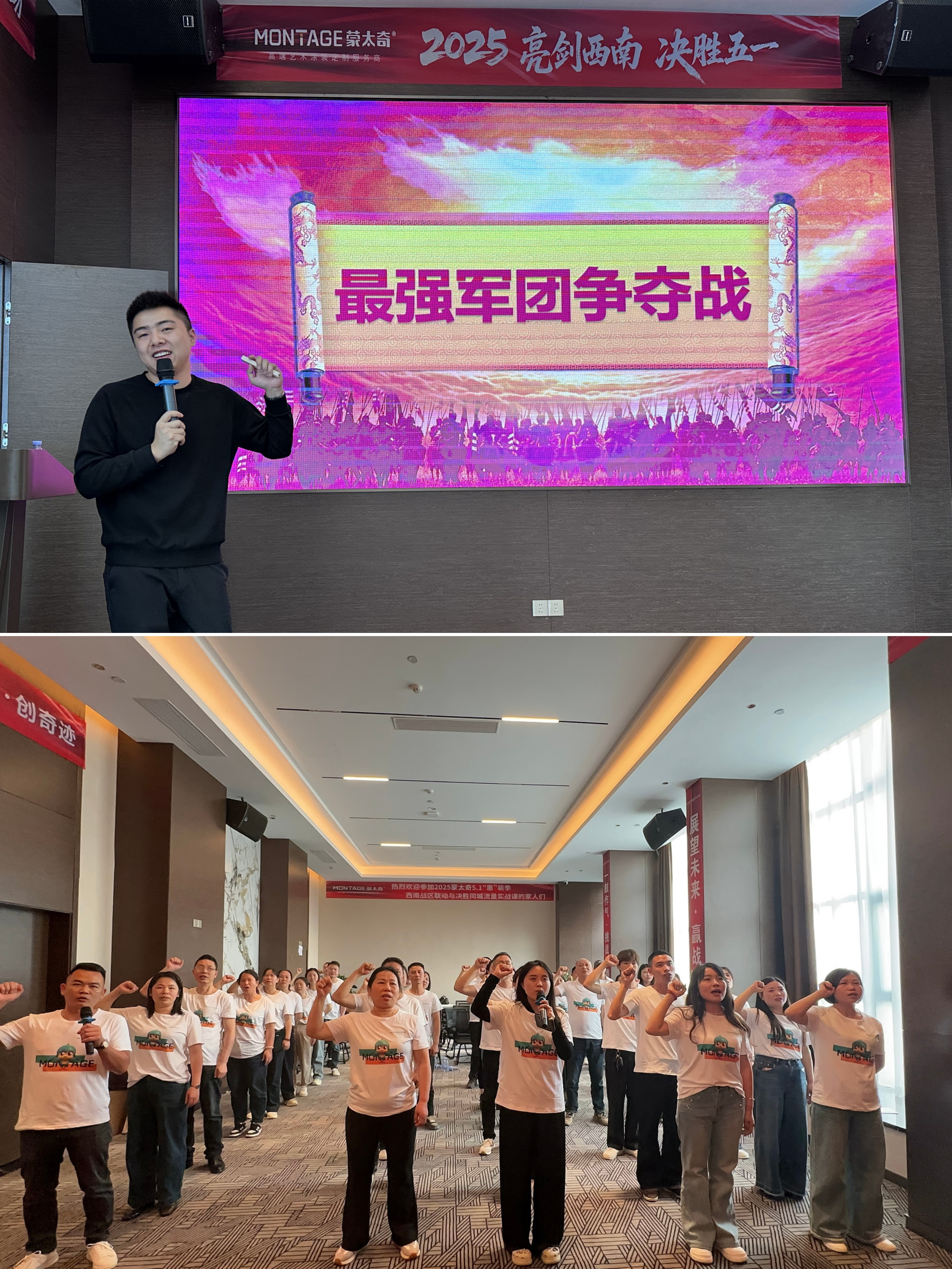 随后,由蒙太奇主动营销总监黄勇详细讲解专属动销政策与流量扶持,并对全体经销商家人们进行作战培训,深度赋能活动落地,助力西南经销商在五一“惠”装季活动斩获佳绩。誓师大会上,在黄勇的引领下,全体经销商信心满满、斗志昂扬,踏上新的业绩征程,向着胜利的目标全速前进。