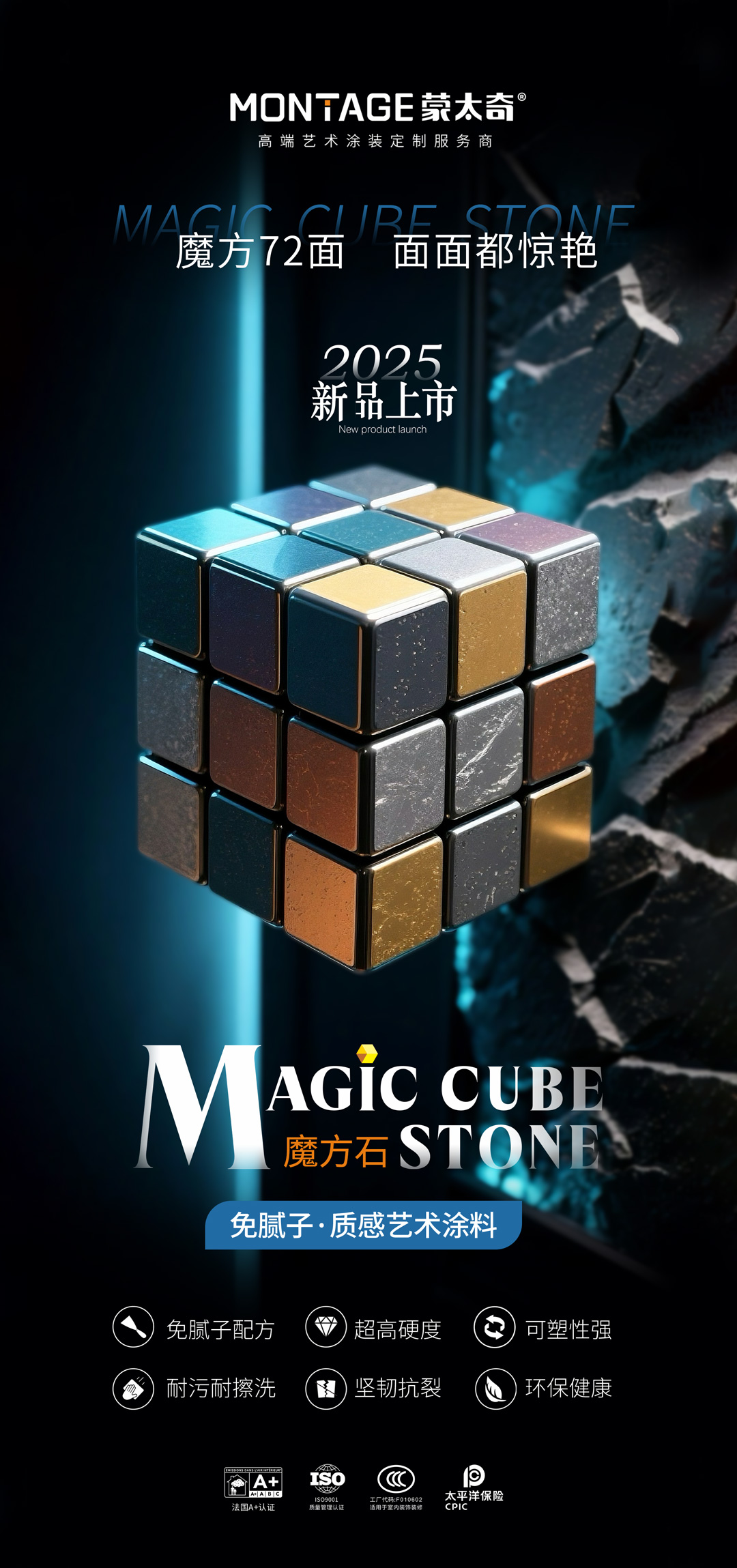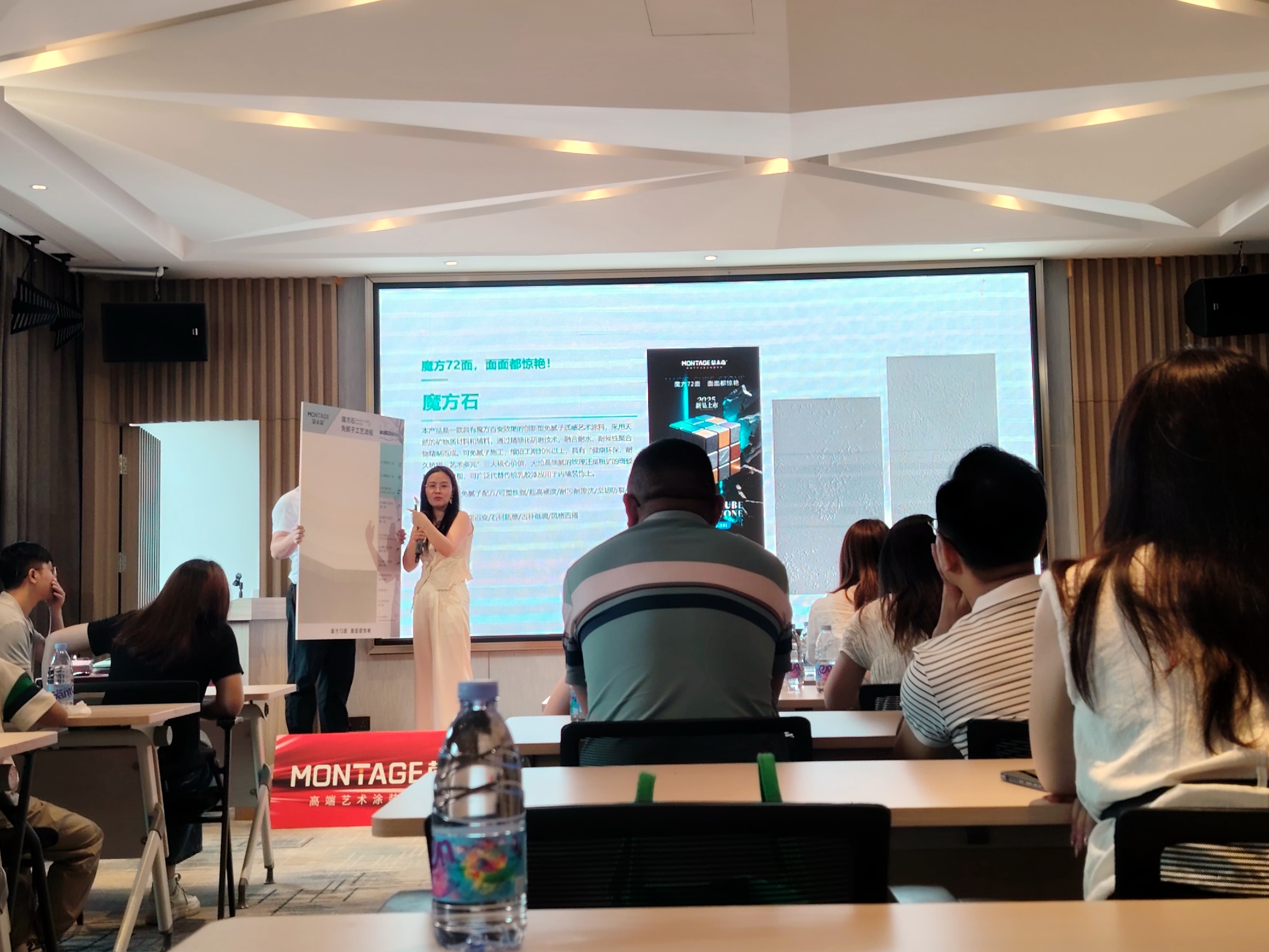 作为本次特训营的核心亮点,蒙太奇联合创始人、“艺术涂料最美老板娘”吕芳方亲自揭晓了蒙太奇全新升级的2025产品矩阵,并正式介绍了蒙太奇新品「魔方石」免腻子·质感艺术涂料。结合市场趋势,深度剖析「魔方石」的产品内核,从工艺技术到材料的运用解读「魔方石」“免腻子创新技术,工期缩短30%以上”、“魔方72面,面面都惊艳”、“硬核实力,品质出众自然出彩”的三大突破性优势。