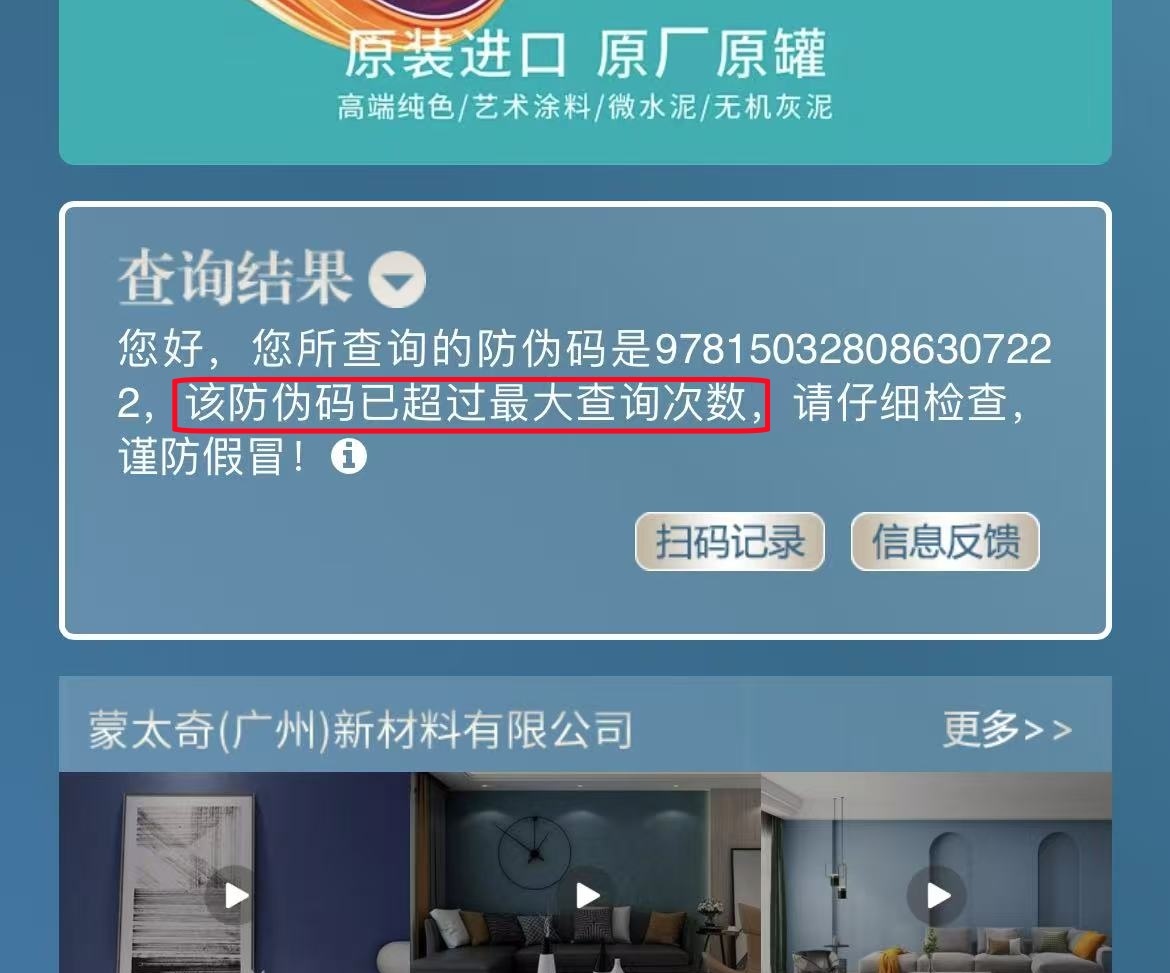 若结果显示“是蒙太奇(广东)新材料有限公司生产的正品”,请再核对查询结果显示的防伪码与产品包装上的防伪码是否一致,若显示以下信息,则该产品为官方正品。