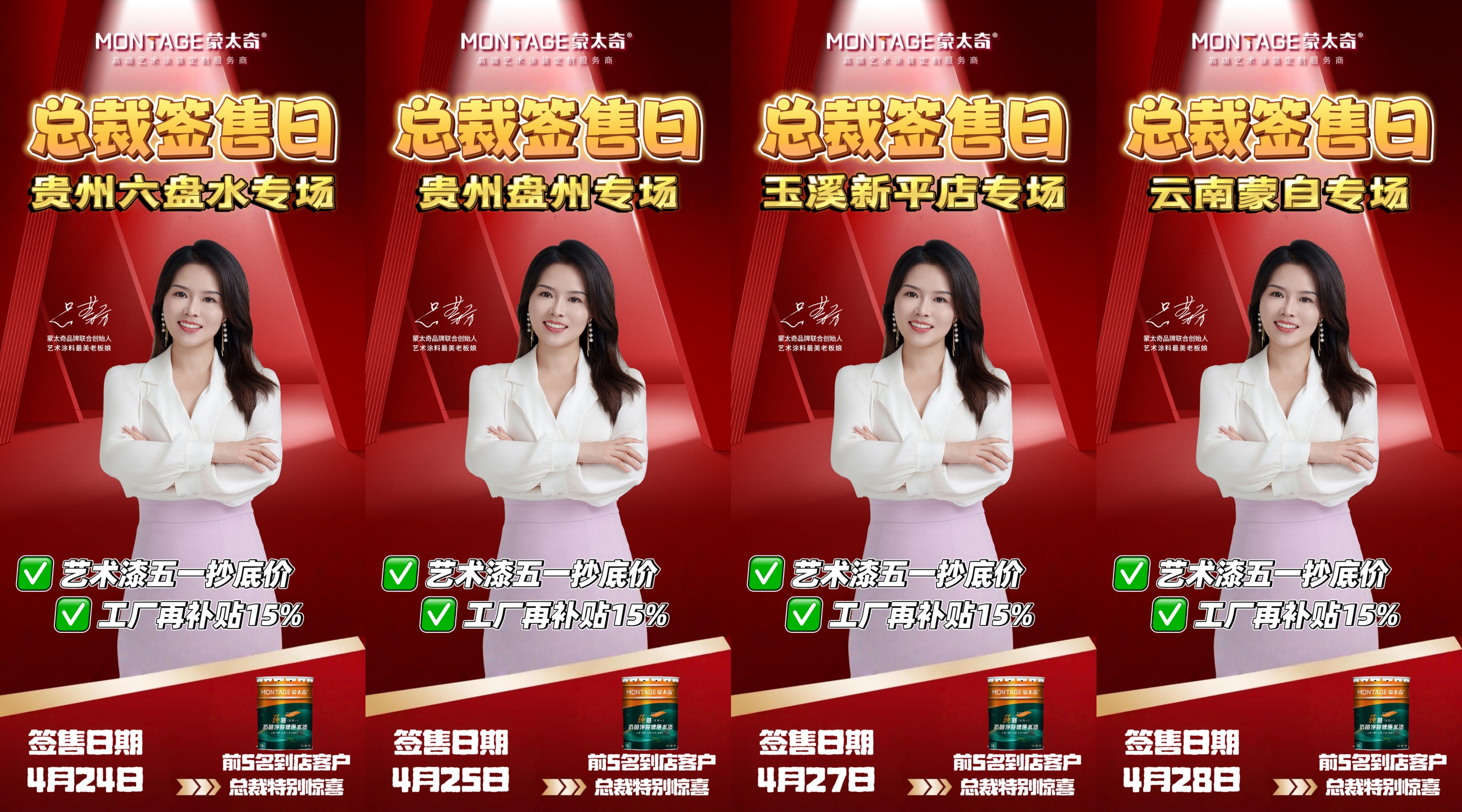 活动期间,蒙太奇联合创始人、艺术涂料最美老板娘吕芳方亲临一线驻店帮扶,以行业领袖的专业力与亲和力赋能终端。4场总裁签售日活动火力全开,为六盘水店、盘州店、新平店、蒙自店注入强劲动能,大大激增单日签单量,点燃抢购热潮!