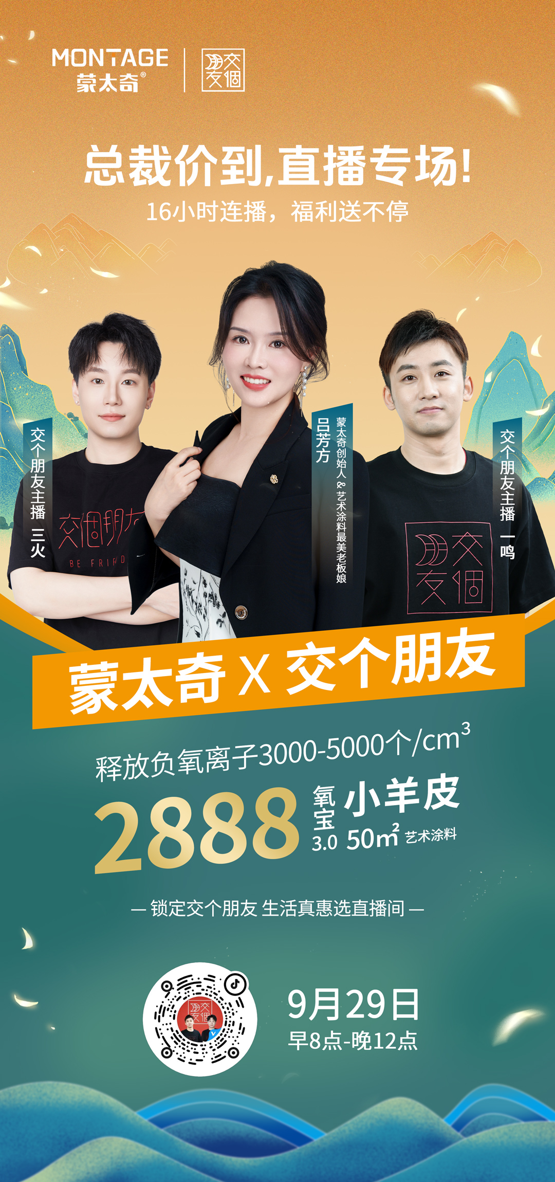 惊喜不等人,优惠限时抢!9月29日早8点-晚12点,锁定抖音“交个朋友生活真惠选”直播间,与蒙太奇一起解锁艺术漆的无限可能,承包你整个假期的焕新计划!点击预约提醒,提前锁定心仪好物!我们不见不散!