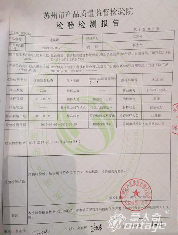 2019年5月,昆山市市场监督管理局对蒙太奇硅藻泥产品进行监督抽查。检验检测结果显示,蒙太奇硅藻泥产品未检测出游离甲醛含量、可溶性重金属以及苯、甲苯、乙苯、二甲苯有害物质。